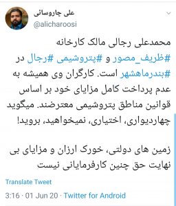 علی چاروسائی مدیرمسئول خبرگزاری ایپنا در پیامی توییتری به اعتراضات کارکنان پتروشیمی رجال واکنش نشان داد.