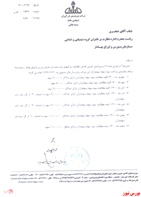 شرکت پتروشیمی فن آوران از زمان بندی پرداخت سود به سهامداران خبر داد.