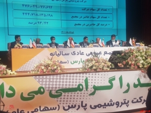 مجمع عمومی عادی سالیانه شرکت پتروشیمی پارس منتهی به سال مالی ۱۴۰۰/۱۲/۲۹ با حضور ۹۳٪(نود و سه درصد) سهامداران در حال برگزاریست.
