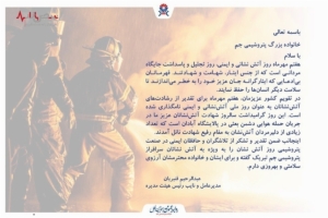 اینجانب ضمن تقدیر و تشکر از تلاشگران و حافظان ایمنی در صنعت پتروشیمی، روز آتشنشان را به ویژه به آتشنشانان سرافراز پتروشیمی جم تبریک گفته و برای ایشان و خانواده محترمشان آرزوی سلامت و بهروزی دارم.