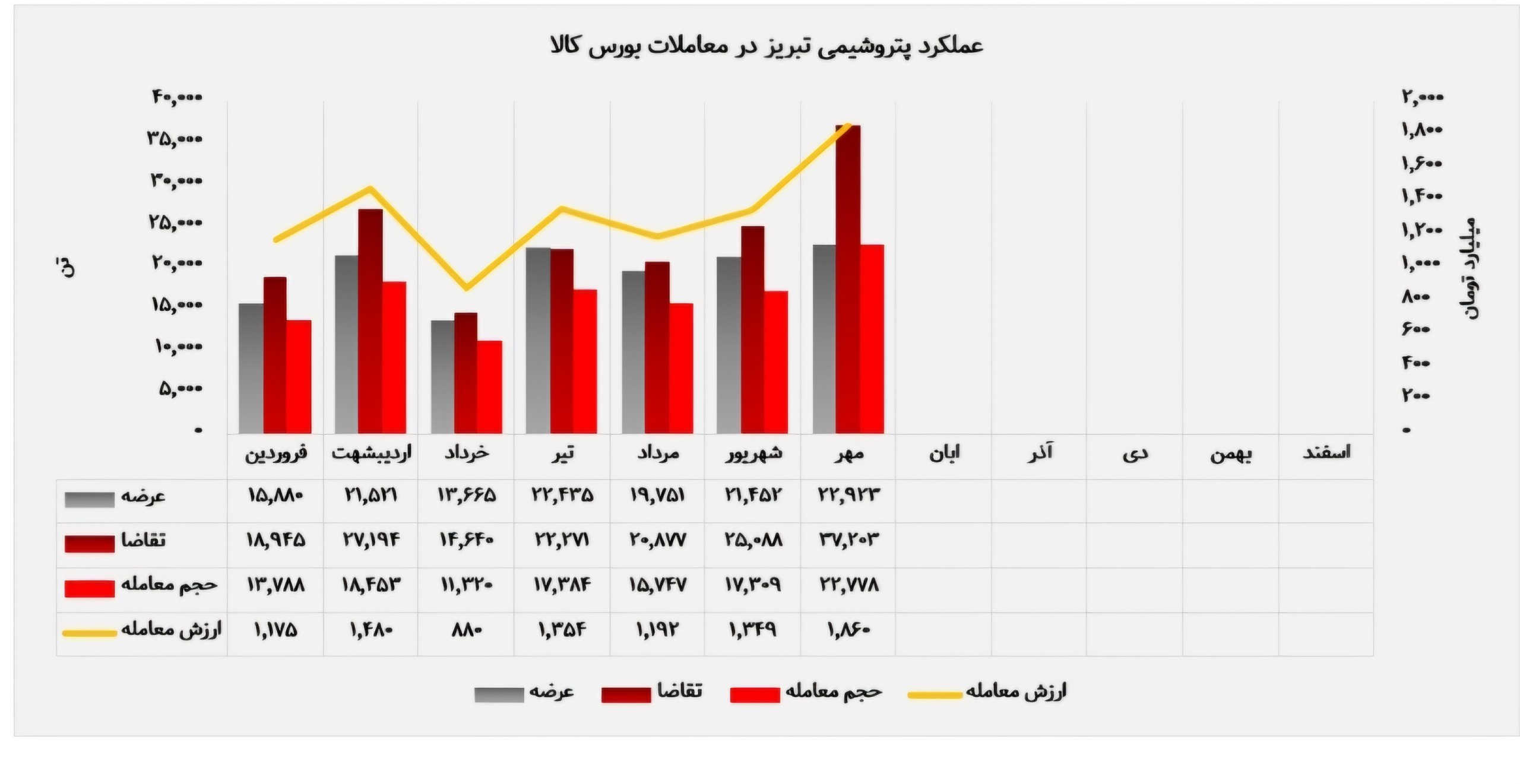 این شرکت در مهرماه با عرضه ۱۳ محصول در بورس کالا حضور یافت. پرفروشترین محصول شرکت پتروشیمی تبریز در این ماه، پلیاتیلن سنگین دورانی 3840UA بود که با ثبت فروش ۹ هزار و ۱۱۹ تنی، بیشترین سهم از معاملات را به خود اختصاص داد و درآمدی معادل ۶۰۱ میلیارد تومان را برای شرکت به همراه داشت.