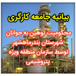 جامعه کارگری با صدور بیانه ای ضمن حمایت ازجوانان غیور شهرستان بندرماهشهر، که در اقدام اخیر مورد اهانت از سوی یکی از واحدهای اداره حراست سازمان منطقه ویژه اقتصادی پتروشیمی به جوانان بومی شهرستان بندرماهشهر را محکوم می کند.