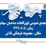 به گزارش خبرگزاری ایپنا به نقل از روابط عمومی پتروشیمی جم جلسه مجمع عمومی عادی بطور فوق العاده شرکت پتروشیمی جم صبح روز دوشنبه تاریخ ۰۵/۰۸/۱۳۹۹ رأس ساعت ۱۰:۳۰ در مجموعه فرهنگی ورزشی تلاش خیابان ولی عصر، پایین تر…