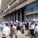 کارکنان نفت به عدم اجرای قانون ماده ده به نشانه اعتراض در مقابل ساختمان این وزارتخانه تجمع کردند.